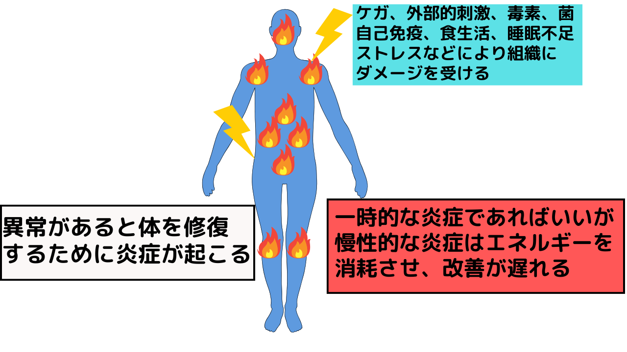 慢性炎症が起こってる人は、常に炎症を起こすためにエネルギーを消費しているため、症状の改善の妨げになります。