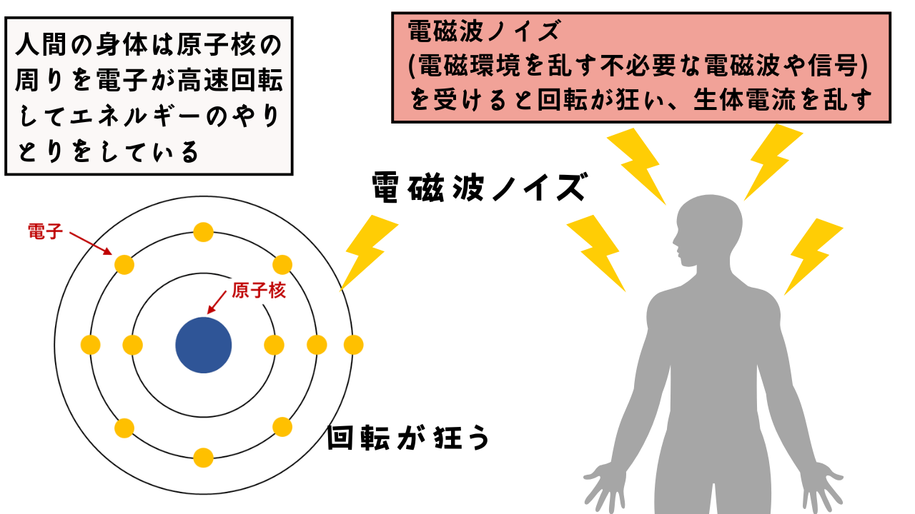 上述したとおり電磁波の影響を受けることで生体電流に乱れを生じ、体の歪み、体液循環の不良、脳機能への影響が起こります。